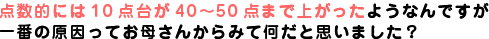 最初は10点台だったり20点台だったり、それが20点台から30点台、、、40点台とか。。
