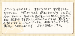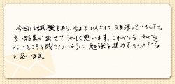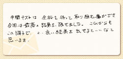 中間テストでは、自分で思っていたより順位が良かったので、期末テストも安定した点数が取れる様、宜しくお願い致します。