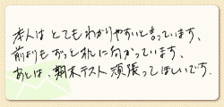 前よりもずっと机に向かっています。あとは、期末テスト頑張ってほしいです。