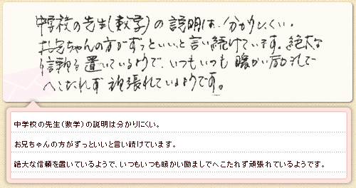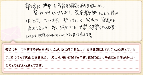 家庭教師にして良かったと思いました。先生とも息子が合ってそうなのでありがとうございます。