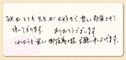 子供がとても先生が大好きで、楽しく勉強させて頂いております。