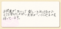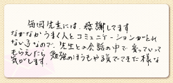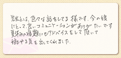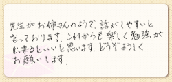 先生がお姉さんのようで、話がしやすいと言っております。これからも楽しく勉強が出来るといいと思います。どうぞよろしくお願いします。