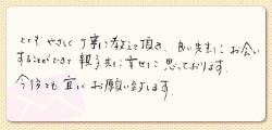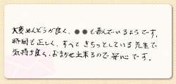 大変めんどうが良く、●●も喜んでいるようです。時間も正しく、すべてきちっとしている先生で 気持ち良く、おまかせ出来るので安心です。