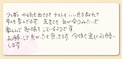 少しずつやる気も出てきて テストもいい点を取れて本人も喜んでます。先生とも気が合うみたいで楽しんで勉強をしているようです。お願いして良かったと思ってます。今後も宜しくお願いします。