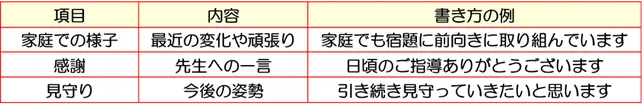 何を書けばよいか迷ったときは、『家庭での様子』+『感謝』+『見守り』の3つを意識するだけで十分です。(下記表1参照)